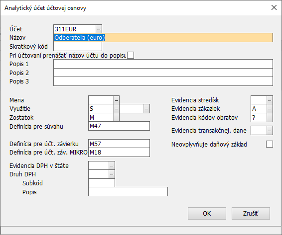 Je možné používať aj písmenové označenie analytického účtu. Napr. 311EUR - Odberatelia (euro) analytický účet k účtu 311 - Odberatelia (z účtovej osnovy)