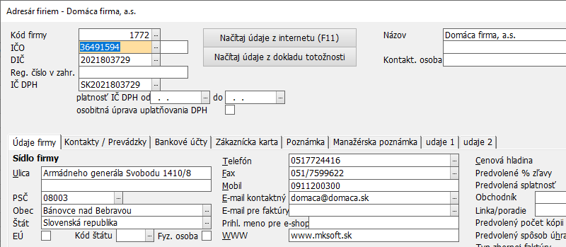 - základné údaje o firme: Názov, Kontakt. osoba, IČO príp. Reg. číslo v zahraničí, DIČ, IČ DPH, sídlo, príznak členskej krajiny EÚ, kód štátu EÚ, príznak fyzickej osoby