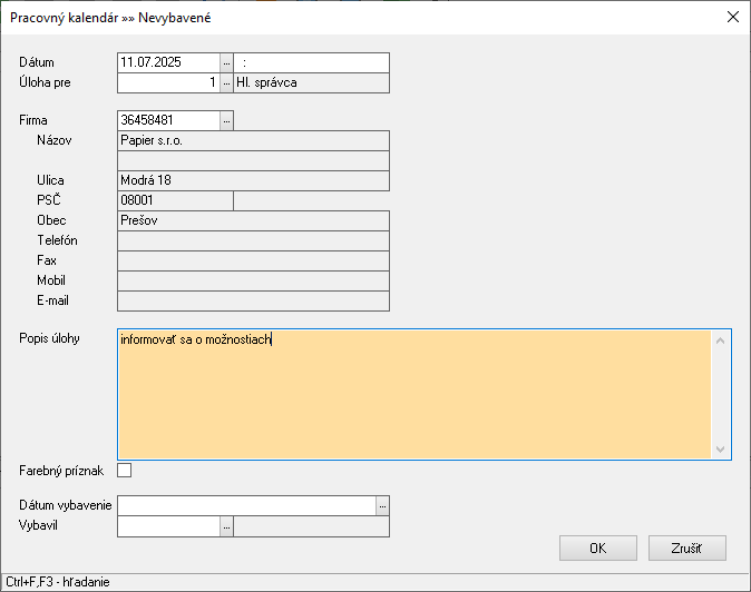 - Firma – kód firmy z adresára firiem, ktorej sa daná úloha týka