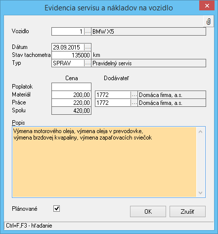 Jedinou povinnou hodnotou je políčko Vozdilo, do ktorého je potrebné zadať platnú hodnotu z číselníka Evidencia vozidiel. Jednotlivé náklady máte možnosť rozlíšiť na cenu poplatku, materiálu a prác so zadaním väzby na dodávateľskú firmu. V políčku popis môžete zadať ľubovoľný text upresňujúci náklady.
