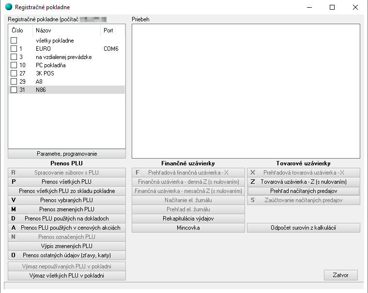 Funkcia je určená pre tzv. "vzdialenú" pokladňu. Program najskôr aktualizuje údaje v cenníku z externého súboru (vytvoreného na inom PC s programom). Súbor si načíta podľa nastavenia z FTP servera resp. z určeného umiestnenia napr. USB disk. Potom takto aktualizované údaje pošle do pripojenej pokladne. - Prenos všetkých PLU - klávesová skratka P