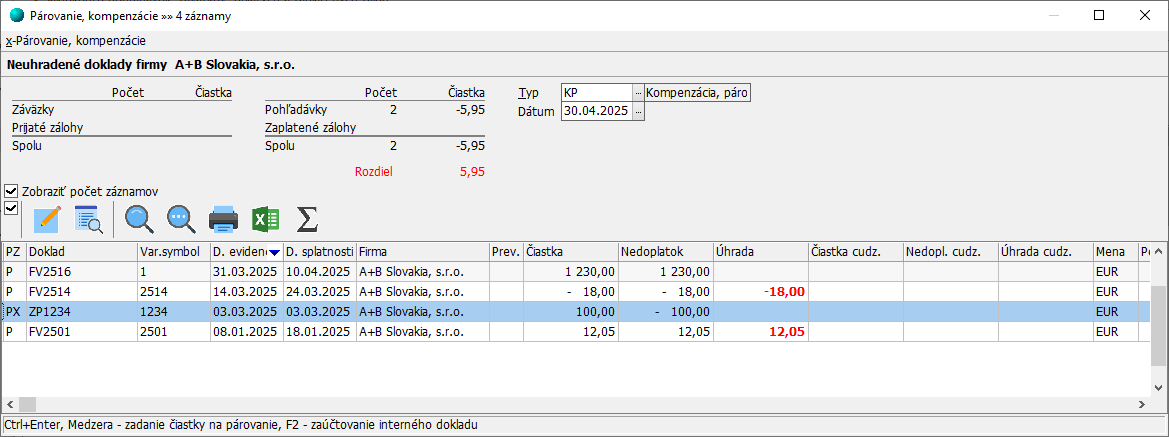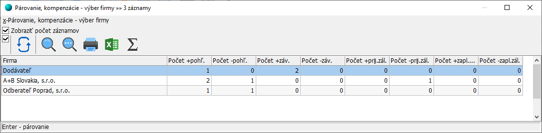 Párovanie dokladov saldokonta podporuje párovanie zálohových platieb s faktúrami, párovanie faktúr s dobropismi a párovanie pohľadávok so záväzkami u všetkých dokladov konkrétnej firmy. Po spustení funkcie na prárovanie, program zobrazí okno so zoznamom všetkých obchodných partnerov, u ktorých je možné kompenzovať doklady.