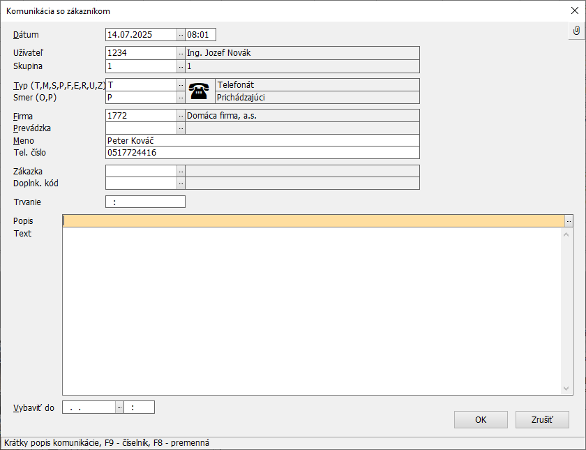 - Text – priestor na poznamenanie dôležitých bodov, resp. poznámok z konkrétneho typu komunikácie
