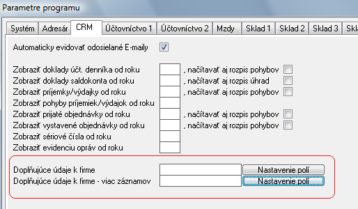 Pomocou nového modulu CRM je možné v Adresári firiem si navoliť nové záložky s doplňujúcimi údajmi na základe Vašich vlastných potrieb. V parametroch programu, cez menu Nastavenia – Parametre – záložka CRM, je možné si tieto doplňujúce údaje nadefinovať. Je tu možné nadefinovať čo všetko by daná záložka mala obsahovať, ako by mala vyzerať, a tiež ako by sa mala volať daná záložka.