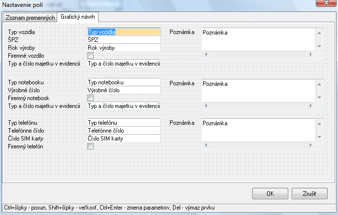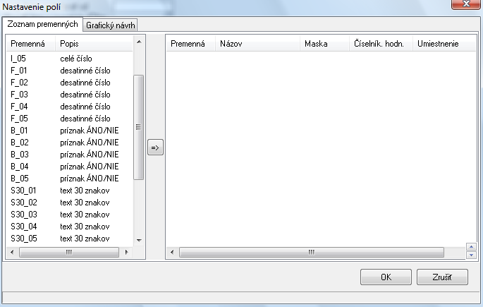 Dôležité je vyplniť políčko Názov premennej, kde si zadávame názov poľa. Údaje o umiestnení nie je potrebné vypĺňať v tomto okne. Umiestnenie okna je výhodnejšie navrhnúť cez záložku Grafický návrh. Vybrané premenné v pravej časti záložky Zoznam premenných je potrebné zoradiť podľa toho, ako budú jednotlivé políčka vypĺňané pri zadávaní už konkrétnych informácii v adresári firiem.