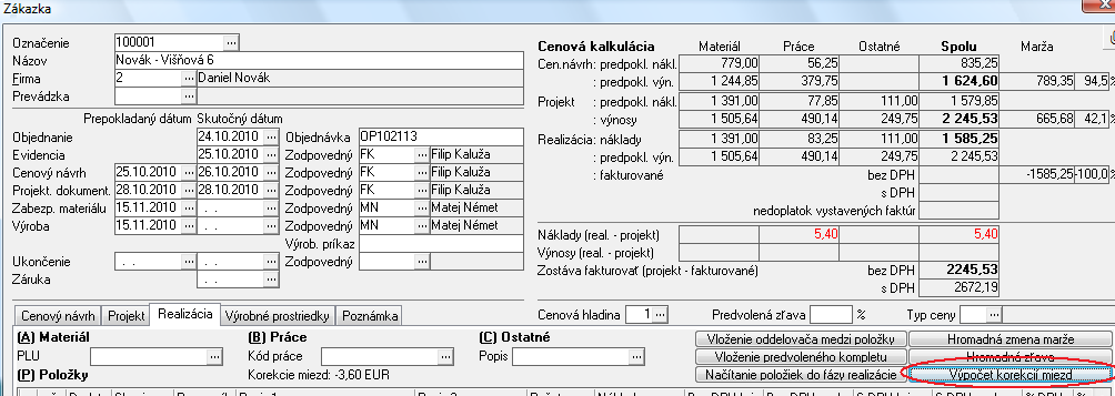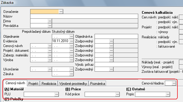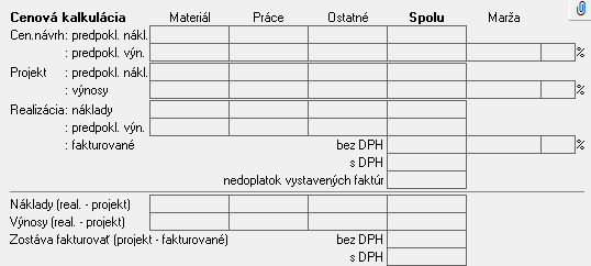 V časti Cenová kalkulácia je možné sledovať náklady a výnosy materiálu vstupujúceho do danej zákazky, vykonanej práce a ostatných položiek vstupujúcich do zákazky a to v každej fáze zákazky, t.j. vo fáze cenového návrhu, vo fáze projektu a v záverečnej fáze realizácie.