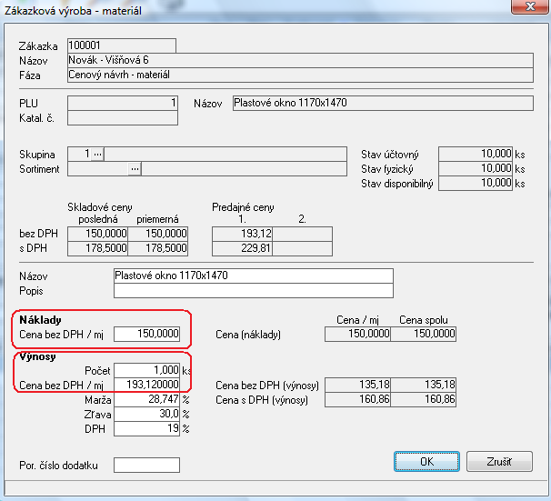 Pri každej položke materiálu je potrebné uviesť aj obstarávacie náklady (skladovú cenu) a predajnú cenu materiálu. Ak tieto údaje sú uvedené na konkrétnej cenníkovej položke v cenníku, tak sa automaticky predvyplnia aj pre zákazku. Aj po automatickom vyplnení údajov je možné meniť ich hodnotu. Pri automatickom predvyplnení nákladov, t.j. skladovej ceny, sa zo skladu prevezme posledná skladová cena.