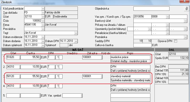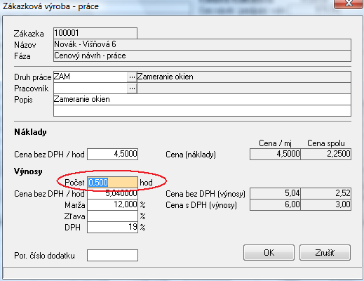- Cena bez DPH, Cena s DPH (výnosy) – cena práce fakturovaná zákazníkovi za hodinu, m2, m3, ks, atď. Táto merná jednotka sa môže líšiť od mernej jednotky, za ktorú je odmeňovaný pracovník.