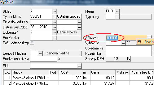 (A) Materiál: materiál, ktorý sa použije na zákazke sa vyskladňuje najčastejšie cez spotrebné výdajky, ale je možné použiť aj iné typy výdajok. Na každej výdaje materiálu je však potrebné zadať číslo zákazky.