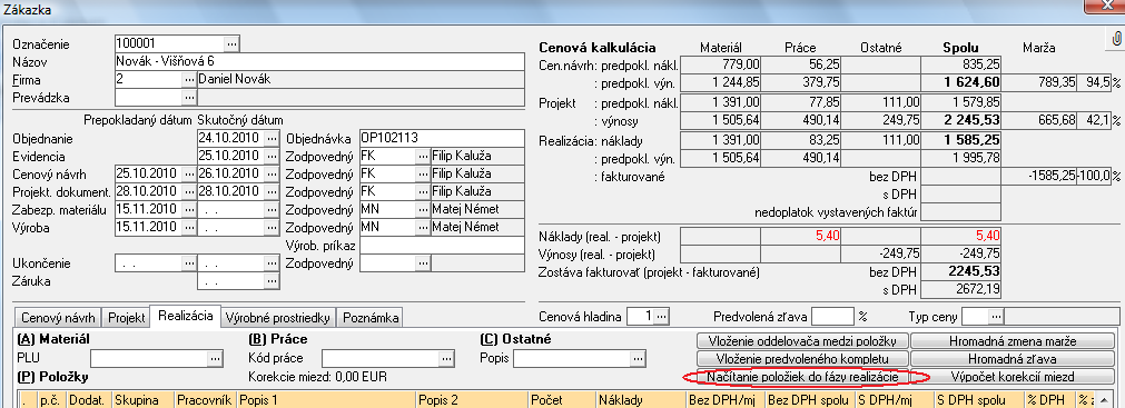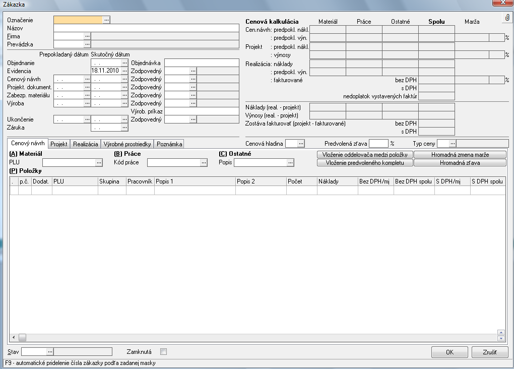Projekt: po odsúhlasení cenového návrhu zákazníkom nastupuje druha fáza zákazkovej výroby a tou je projektová dokumentácia. Zadaním skutočného dátumu do fázy cenového návrhu sa pri editácii zákazky program automaticky nastaví na záložku „Projekt“. Načítanie materiálových položiek, práce a ostatných položiek z cenového návrhu je možné pomocou tlačidla „Načítanie položiek podľa cenového návrhu“.