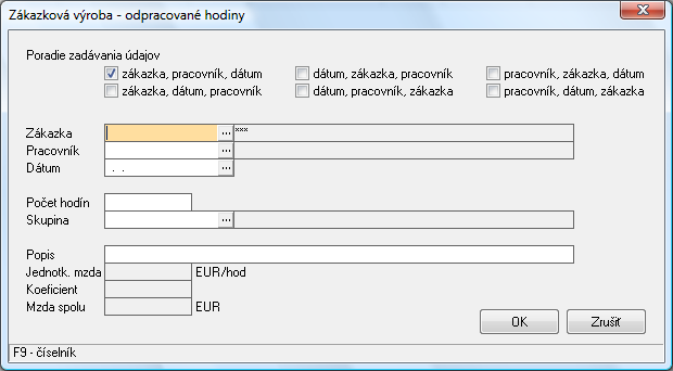 Počet odpracovaných hodín sa zadáva vždy až po zadaní vyššie uvedených údajov. Napr.: ak je predvolené poradie zákazka – pracovník – dátum, tak pri novom (v poradí druhom a ďalšom) zázname odpracovaných hodín sa program nastaví až do políčka dátum, lebo sa predpokladá, že políčka zákazka a pracovník sa nemenia a políčko dátum sa mení najčastejšie.