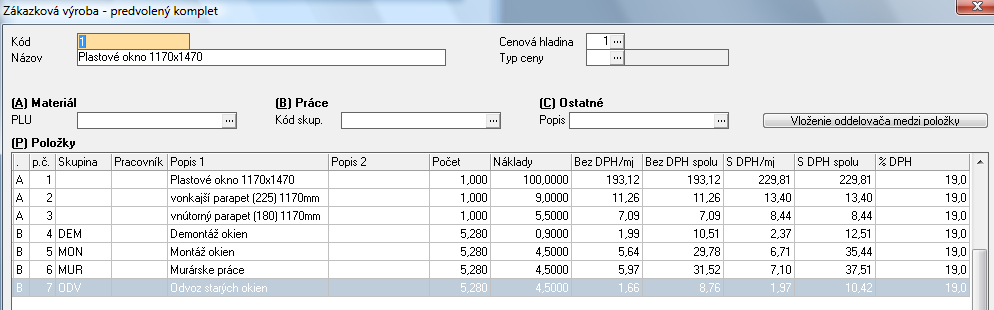 V prípade často opakujúcich zákaziek je možné si preddefinovať tzv. komplety, ktoré obsahujú preddefinované množstvo materiálu, práce a ostatných položiek, ktoré sú na danú zákazku potrebné.- Kód – kód kompletu,