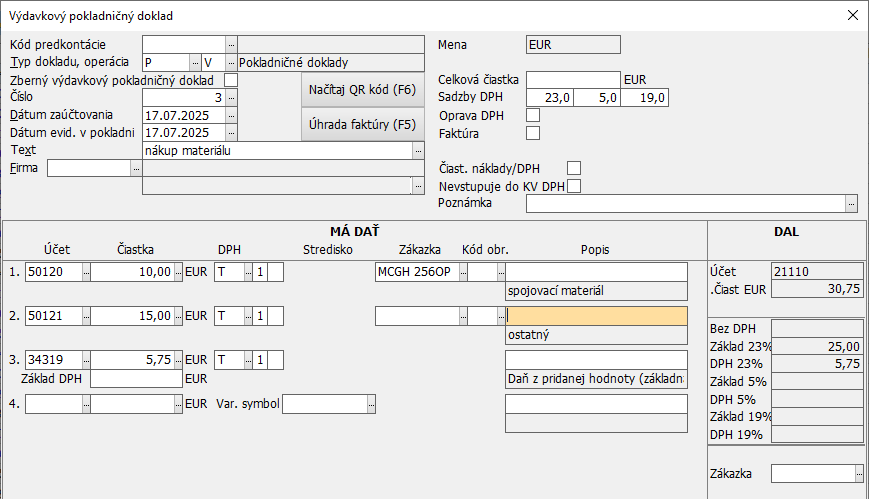 Pri zadávaní pohybov pokladničných a bankových dokladov zadávate priamo čísla účtov a ostatné údaje - popis, kódy DPH a čiastky podľa hladín DPH pre stranu MÁ DAŤ alebo DAL (účet na druhej strane sa preberá z nastavenia danej pokladne / bankového účtu).