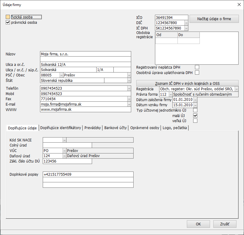 Po vytvorení firmy a účtovného roku sa pri prvom spustení aplikácie zobrazí okno Údaje firmy, kde zadáte údaje Vašej firmy. Okno je logicky rozdelené na dve časti, vo vrchnej časti okna sú základné údaje firmy. V spodnej časti sú ďalšie údaje rozdelené do záložiek: Doplňujúce údaje, Doplňujúce identifikátory, Prevádzky, Bankové účty, Oprávnené osoby a Logo, pečiatka. Jedinými povinnými údajmi sú právna forma a názov firmy, ktoré musia byť zadané.