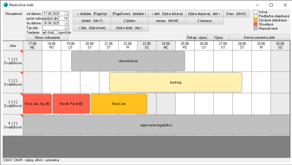 Tlačidlá v hornej časti okna < obdobie (PageUp), (PageDown) obdobie >, ... (šípka dole) izby > - predstavujú navigačné tlačidlá pre zobrazenie požadovaného obdobia. Nastavením kurzora myši na izbu alebo deň a stlačením pravého tlačidla myši sa zobrazí menu s viacerými možnosťami. Menu sa mení v závislosti od dní a typu panela v príslušnom dni.