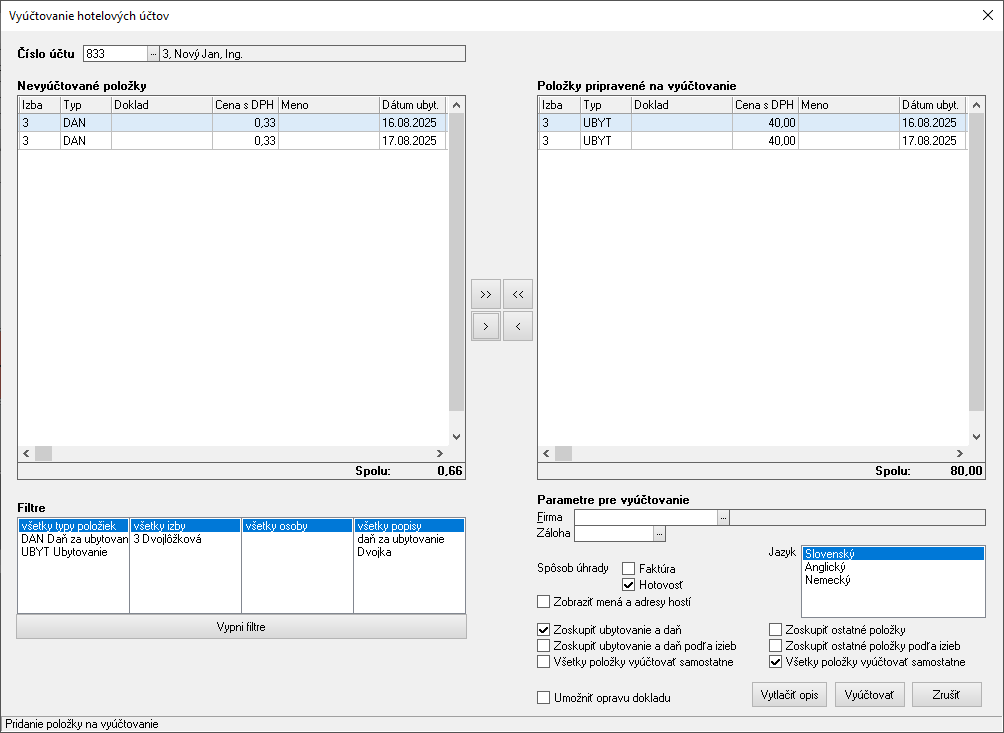 Nevyúčtované položky je možné presunúť na vyúčtovanie hromadne >>, jednotlivo > alebo prostredníctvom medzerníka. Zapnutím filtrov v spodnej časti okna zobrazíte len požadované položky. Zmenou izby resp. zmenou čísla účtu je možné vyúčtovať aj niekoľko izieb súčasne. T. zn. najprv sa prenesú vybrané položky jednej izby na vyúčtovanie, následne sa zmení izba, vyberú sa položky a prenesú k položkám prvej izby na vyúčtovanie.