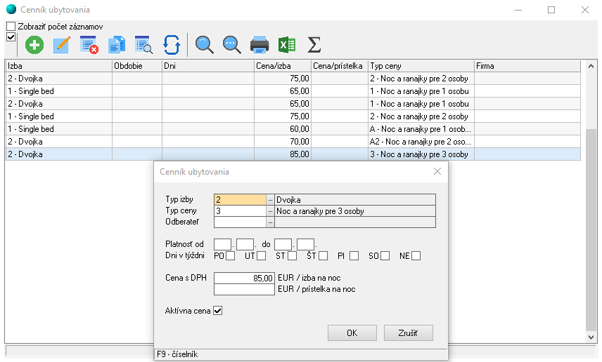 Prostredníctvom menu Sklad – Hotel – Cenník je potrebné nadefinovať ceny jednotlivých izieb v závislosti od typu izby, typu ceny, obdobia resp. konkrétneho ubytovaného/odberateľa v rôznych kombináciách. V cenníku je potrebné pre každý typ izby vytvoriť jednu alternatívu ceny za ubytovanie, kde typ ceny nebude zadaný. V takomto prípade sa bude brať do úvahy cena základná.