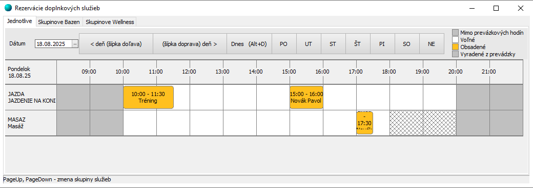 Pokiaľ ide o skupinu služieb (Jednotlivé), v rámci ktorej sa ponúka viacero služieb (služba JAZDA, služba MASAZ), v okne Rezervácií sa bude zobrazovať len konkrétny deň s aktuálnym dátumom, kde je možné zadávať rezervácie.
