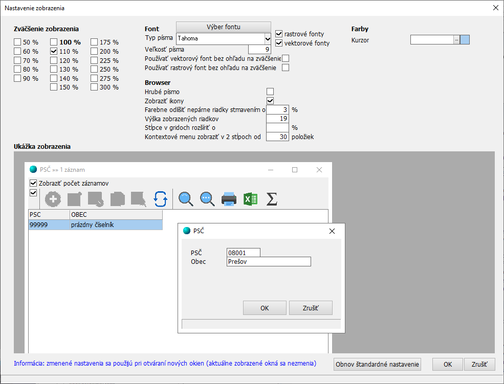 - Zväčšenie okien - v dialógovom okne môžete upraviť zväčšenie zobrazenia, typ a veľkosť fontu, farbu kurzora a nastavenie okien browser