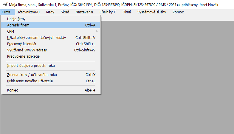 V jeho hlavičke je zobrazený názov vybratej firmy, prevádzka (ak je zadaná), skratky programových modulov, aktuálny účtovný rok a meno prihláseného užívateľa.