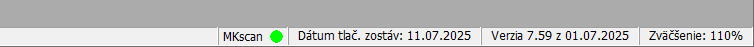 V spodnej časti okna je stavový riadok. V prípade potreby sa v ňom zľava zobrazujú informácie o práve prebiehajúcej činnosti. V pravej časti stavového riadka sa kliknutím myšou na príslušný popis dá nastaviť Dátum tlačových zostáv (predvolene aktuálny dátum počítača) a Zväčšenie - zväčšenie zobrazenia okien, font písma, farba kurzora (pozri nižšie menu Okná). Tiež sa tam nachádza informácia, či je program pripravený na komunikáciu s android aplikáciou MK Scan (signalizovaný zelenou guličkou). Po kliknutí na prvok sa zobrazia informácie potrebné pre nastavenie aplikácie.