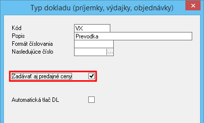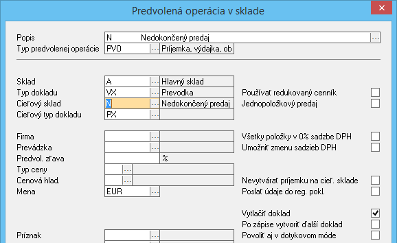 2. Vytvorenie predvolenej operácie pre presun na sklad nedokončeného predaja - otvorte si z menu hlavného okna Sklad - Predvolené operácie. Pridajte nový záznam pre presun tovaru. V políčku popis si zobrazte číselník a vyberte hodnotu X Presun zo skladu A na sklad ..., program predvolí hodnoty ostatných políčok. V políčku typ dokladu zobrazte číselník typov dokladov a skontrolujte nastavenie parametrov "prevodky" (výdajky pre presun tovaru) - zapnite voľbu zadávať aj predajné ceny (štandardne je na spotrebných výdajoch vypnutá). Popis predvolenej operácie upravte podľa vlastného uváženia. V políčku cieľový sklad vyberte sklad vytvorený v kroku 1.