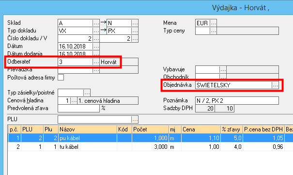 Podľa požadovaného daňového dokladu (faktúra resp. hotovostný doklad) vyberte príslušnú predvolenú operáciu príp. ak nevytvárate doklady cez predvolené operácie nastavte na výdajke sklad nedokončeného predaja a typ dokladu. Zadajte odberateľa a prejdite k zadávaniu položiek na doklad. Pri aktívnom políčku pre výber položiek z cenníka stlačte na klávesnici Enter alebo F9.