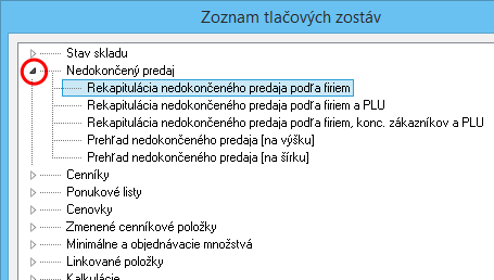 Pre zobrazenie rekapitulácií a prehľadov tovaru, ktorý je aktuálne na sklade nedokončeného predaja otvorte okno cenníka (menu hlavného okna Sklad - Cenník) a vyberte si výpisy (Ctrl + V). V následne zobrazenom okne so zoznamom tlačových zostáv rozbaľte uzol Nedokončený predaj. Vyberte požadovanú zostavu a stlačte tlačidlo Zobraz a zadajte výberovú podmienku.