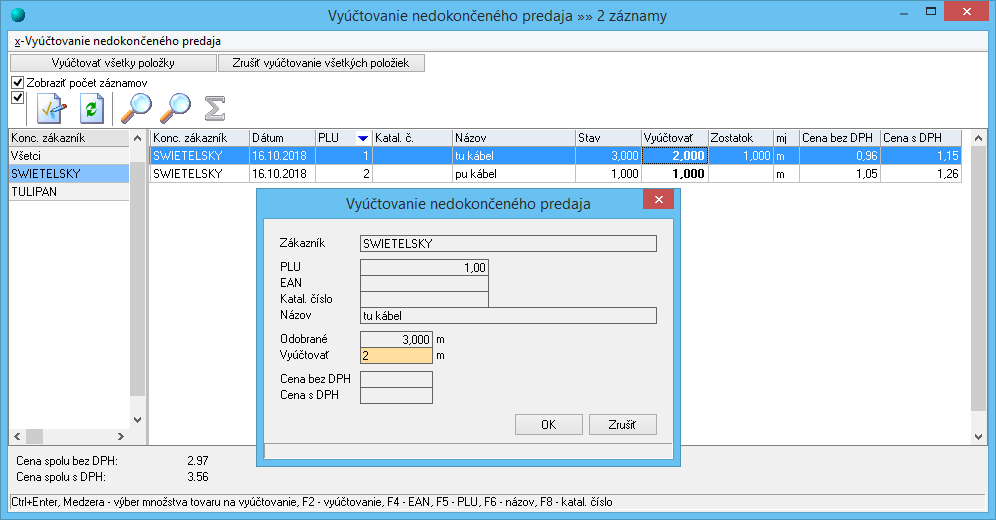 Kliknutím na príslušný záznam môžete vyúčtovávať položky prislúchajúce len tomuto záznamu príp. kliknutím na záznam s názvom Všetci môžete vyúčtovávať všetky položky odberateľa na sklade nedokončeného predaja. Ak potrebujete zmeniť množstvo vyúčtovávanej položky stlačte na položke Ctrl+Enter. Stlačením klávesu medzera na položke vyúčtovávate celé množstvo príp. rušíte vyúčtovanie celého množstva. Ak potrebujete vyúčtovávať položky viacerých zákazníkov odberateľa na jednom doklade, je to možné označením (medzerou) viacerých záznamov v ľavej časti okna. Po nastavení požadovaných množstiev vyúčtovávaných položiek (v pravej časti okna) pre "prenesenie" do výdajky stlačte kláves F2.