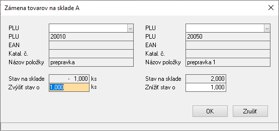 Pre zadanie hodnôt stlačte na aktívnom zázname Ctrl + Enter. Program následne zobrazí editačné okno. V jeho ľavej časti sa nachádza tovar, ktorý idete zameniť, v pravej vyberáte tovar, za ktorý bude zamenený. Pre zámenu je potrebné zadať hodnoty v políčkach Zvýšiť stav o a Znížiť stav o.