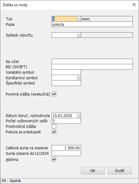 Program obsahuje aj možnosť evidovať povinné zrážky (exekučné). Označením príslušného parametra sa odkryjú ďalšie políčka, ktoré ovplyvňujú ich výpočet. Výška zrážky je závislá od príjmu, počtu vyživovaných osôb a ak sa jedná o výživné na maloletú osobu, tak aj od dátumu narodenia.