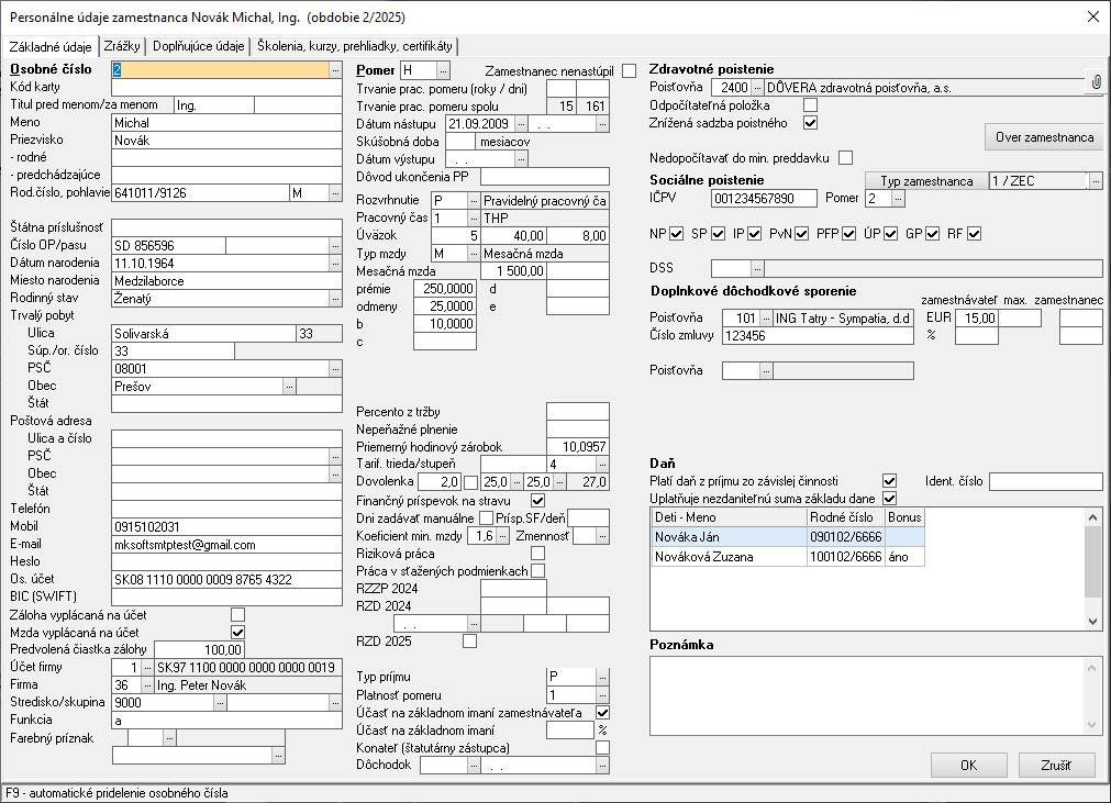 V ľavom stĺpci vyplňte základné personálne údaje zamestnanca. V spodnej časti stĺpca nastavte nasledovné údaje: