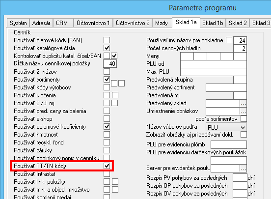 Z menu hlavného okna programu vyberte Nastavenia-Parametre a na záložke Sklad1a zapnite parametre Používať TT/TN kódy.
