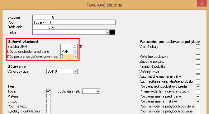 V číselníku tovarových skupín (menu C-Číselníky - Sklad - Tovarové skupiny) vytvorte požadovaný počet tovarových skupín pre cenníkové položky, ktorých sa týka prenesenie daňovej povinnosti. V nastavení daňových vlastností správne použite nasledovné hodnoty. Zadajte sadzbu DPH, ktorá sa uplatní ak nie sú splnené podmienky pre prenos daňovej povinnosti. V políčku Dôvod oslobodenia od dane vyberte z číselníka hodnotu PDP. V políčku Kód pre prenos daňovej povinnosti vyberte z číselníka jednu z nasledovných hodnôt:
