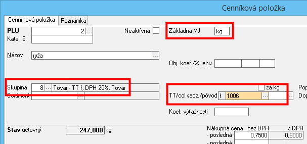 V okne cenníka je potrebné zmeniť na položkách, ktorých sa týka prenesenie daňovej povinnosti tovarovú skupinu a zadať kód colného sadzobníka. Zároveň skontrolujte zadanie základnej mernej jednotky. Merná jednotka a kód colného sadzobníka sa využívajú pre správne zaúčtovanie pohľadávok do saldokonta a pre vytváranie kontrolného výkazu pre DPH. V políčku merná jednotka v dôsledku kompatibility s kontrolným výkazom odporúčame používať jednotky ks, kg, t, m (m2, m3).