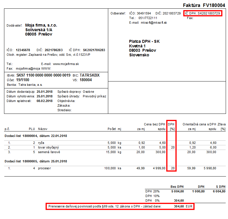 Príklad vytvorenia daňového dokladu - faktúry obsahujúcej tovar s prenosom daňovej povinnosti na odberateľa podľa §69 ods. 12 zákona o DPH.