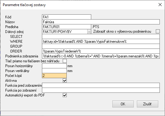 Vytvor novú zostavu - program zobrazí okno parametrov tlačovej zostavy s predvyplnenými hodnotami vybranej tlačovej zostavy. Pre vytvorenie novej zostavy zmeňte hodnotu v políčku Kód. Ak chcete pre novovytvorenú zostavu vytvoriť aj vlastnú predlohu, zmeňte hodnotu aj v políčku Predloha. Po potvrdení okna budú pred tlačovou zostavou s vlastnou predlohou zobrazené červené písmená PM.