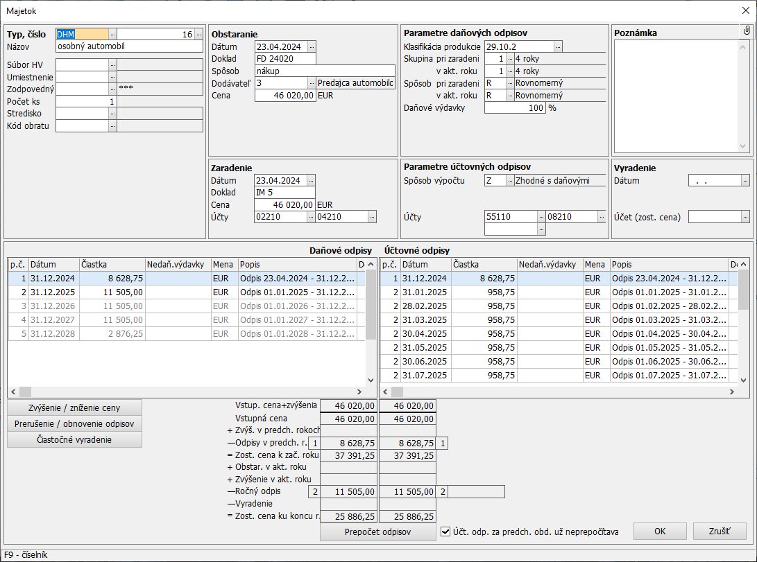 Program podľa ceny majetku pri zaradení a nastavenia parametrov odpisovania vypočíta daňové a účtovné odpisy. Odpisy pre jednotlivé roky sú zobrazené v strede okna majetku.