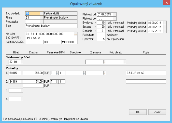 Okno Opakované pohľadávky, záväzky, príkazy na úhradu slúži pre evidenciu pravidelne sa opakujúcich záväzkov - napr.: nájom, poistné, lízing atď. Okno zobrazíte z menu hlavné okna Účtovníctvo-U - Opakované pohľadávky, záväzky, príkazy na úhradu.