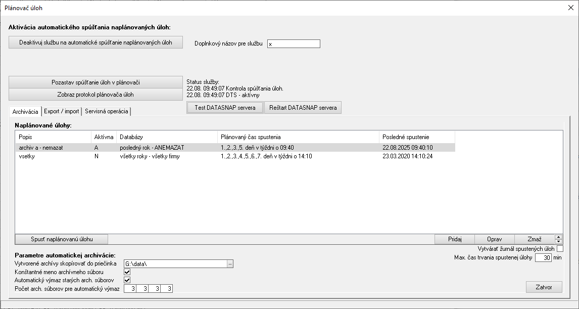Pre spúšťanie pripravených úloh je potrebné aktivovať (nainštalovať) službu operačného systému. Službu je možné aktivovať len na PC, na ktorom je program nainštalovaný - pri sieťovej inštalácii je to server. Službu aktivujete stlačením tlačidla Aktivuj službu na automatické spúšťanie naplánovaných úloh. V okne, pod aktivačným tlačidlom je zobrazená informácia o stave služby.
