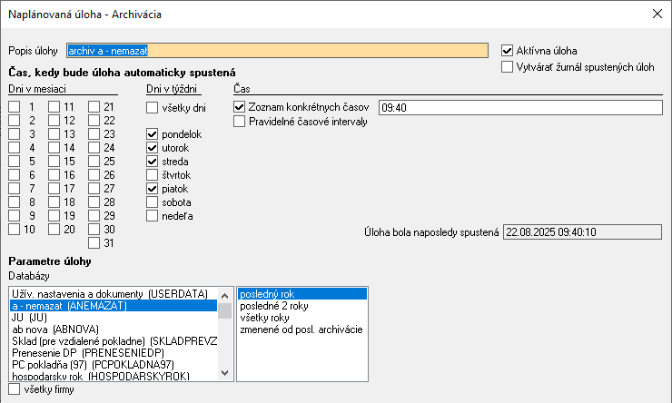 Novú úlohu pre archiváciu vytvoríte stlačením tlačidla Pridaj. Program následne zobrazí okno pre nastavenie parametrov danej úlohy. V okne Naplánovaná úloha - Archivácia vyberte požadované databázy a vyberte jednu z hodnôt: posledný rok, posledné 2 roky, všetky roky resp. zmenené od posl. archivácie. Nastavte Dni v mesiaci alebo Dni v týždni a Čas, kedy sa má daná úloha spustiť.