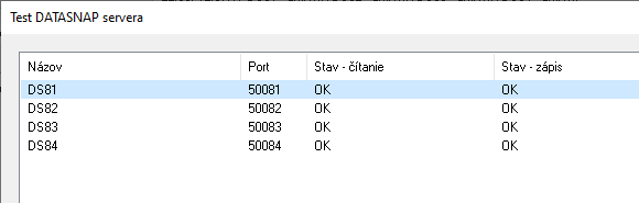 Stlačením tlačidla program otestuje spustené DATASNAP servery cez plánovač úloh. Vykoná sa testovacie čítanie a testovací zápis v príslušne otvorenej databáze.