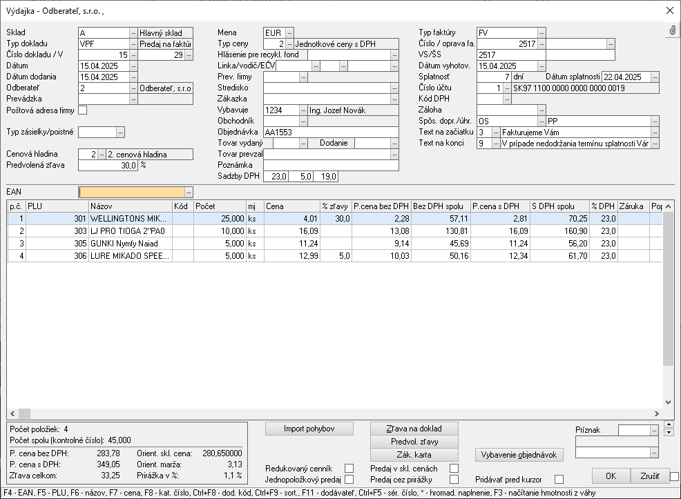 - výdaj - predajný (VP), spotrebný (VS), presun na iný sklad (VX)