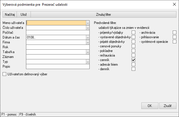 V okne sa nachádzajú záznamy vybraných udalostí pri práci s programom. Kôli veľkému množstvu záznamov sú po otvorení okna zoberazené udalosti len za posledné tri dni. Ak chcete zobraziť aj staršie udalosti je potrebné pri zadaní výberovej podmienky filtra zadať v políčku dátum a čas požadovaný údaj.