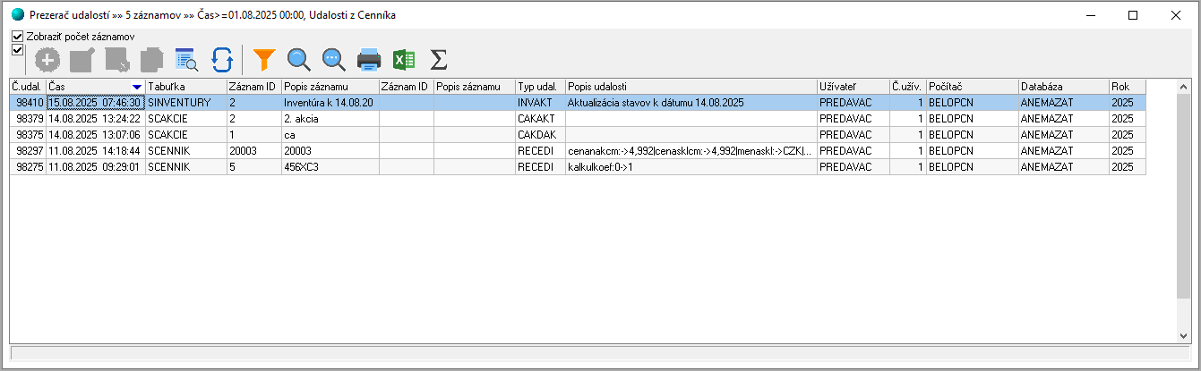 Ak vás zaujímajú zmeny konkrétnych záznamov - v príslušnom okne programu napr. cenník stlačte na vybranom zázname klávesy Alt + Num + a stlačte tlačidlo Zobraziť vybrané udalosti z histórie vybraného záznamu.