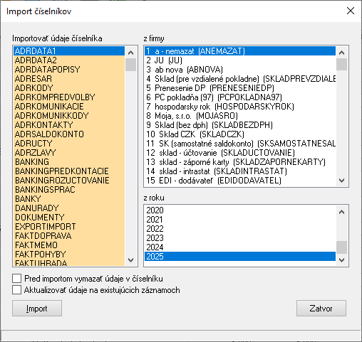 Po vybratí tejto funkcie sa zobrazí dialógové okno s možnosťou importu údajov z vybraného číselníka inej firmy (zo zoznamu firiem) z vybraného roku. Ak zaškrtnete voľbu Pred importom vymazať údaje v číselníku budú vymazané záznamy v číselníku aktuálnej firmy. Ak chcete aktualizovať už existujúce záznamy, zaškrtnite voľbu Aktualizovať údaje na existujúcich záznamoch.