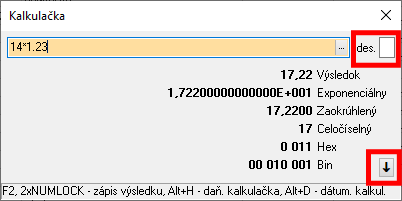 Po vybratí tejto funkcie sa zobrazí dialógové okno kalkulačky. Kliknutím na ikonu Šípka dole v spodnej časti okna zobrazíte rozšírené funkcie kalkulačky. Okno des. vpravo hore slúži pre zadanie počtu desatinných miest, na ktoré bude kalkulačka zaokrúhľovať počítané hodnoty.