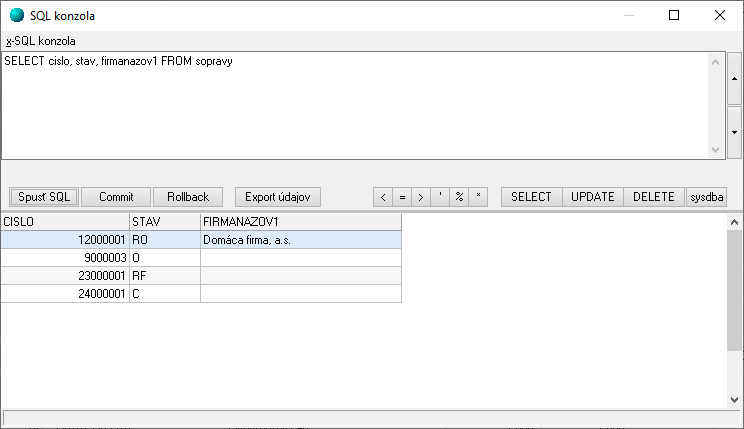 Po vybratí tejto funkcie sa zobrazí dialógové okno s možnosťou priamo zadávať SQL príkazy pre prácu s databázovým súborom. SQL konzola sa dá vyvolať z každého okna programu stlačením kláves Ctrl + F12.