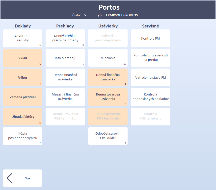 Vklad, Výber, Zámena platidiel, Úhrada faktúry, Denná finančná uzávierka, Denná tovarová uzávierka, Denná uzávierka POS terminálu – funkcie, ktoré sa zapisujú do fiskálnej tlačiarne a sú nevratné. Funkcie v časti Prehľady (Denný prehľad pracovnej zmeny, Info o predaji, Denná finančná uzávierka, Mesačná finančná uzávierka, Denná uzávierka POS terminálu) je možné spúšťať opakovane, ich spustením nedochádza k výmazu dát.