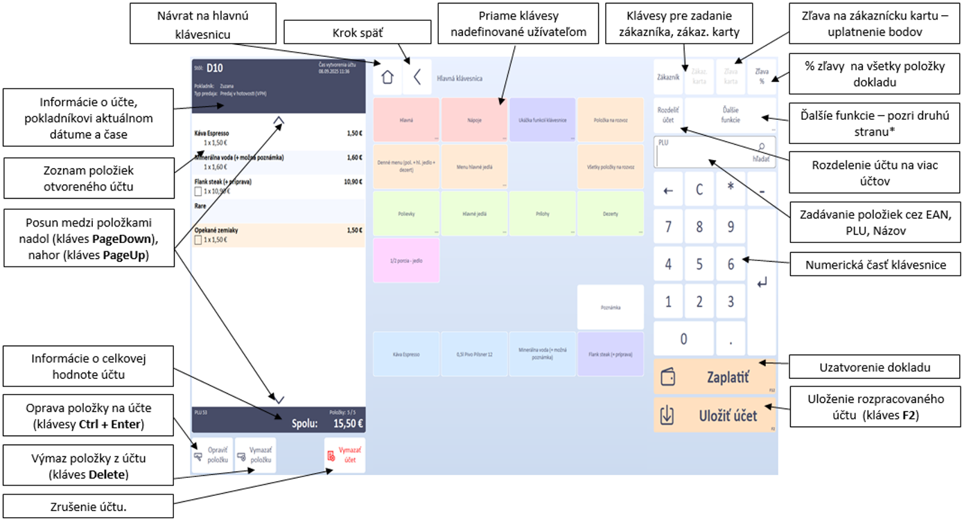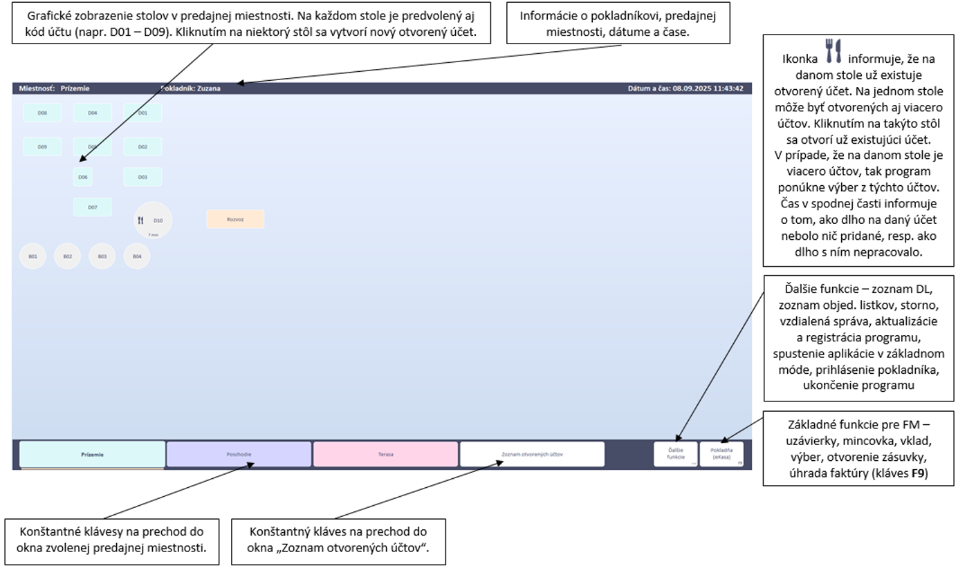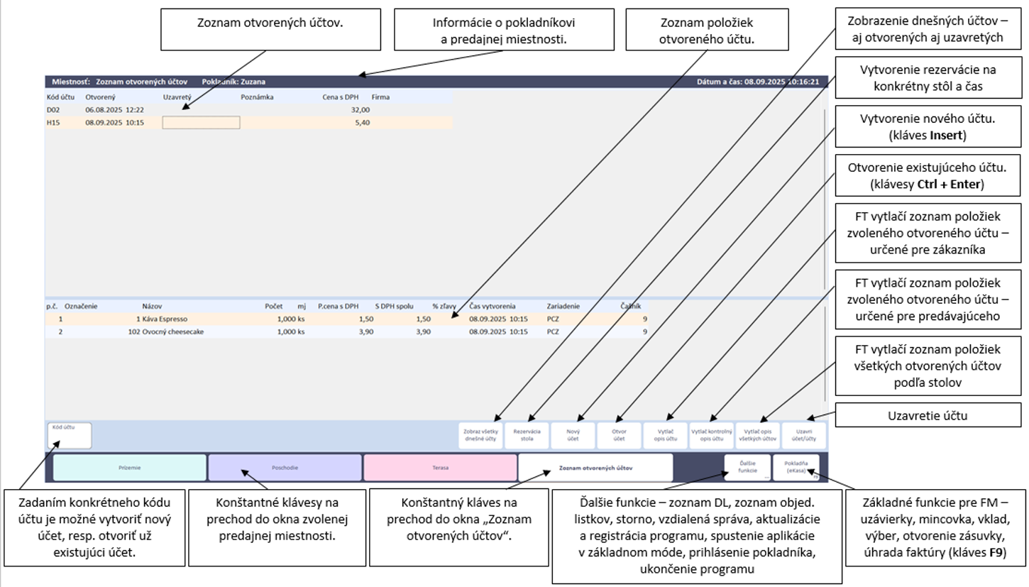 Funkcie pre prácu so zariadením eKasa sú dostupné stlačením tlačidla z okna príslušného priestoru resp. Zoznam otvorených účtov.